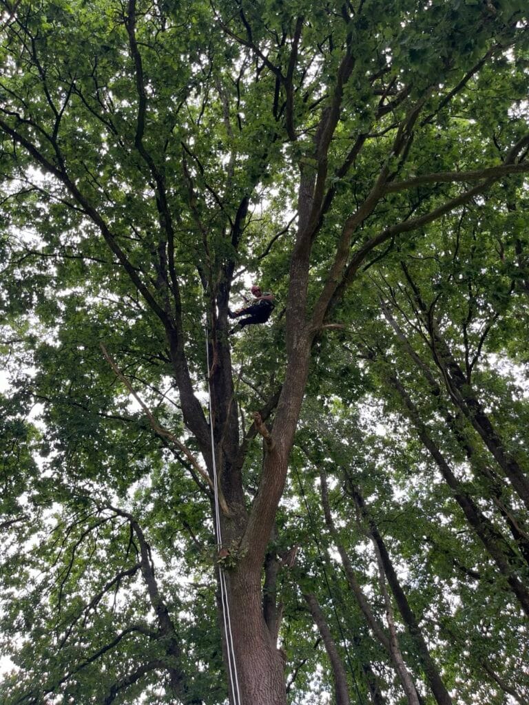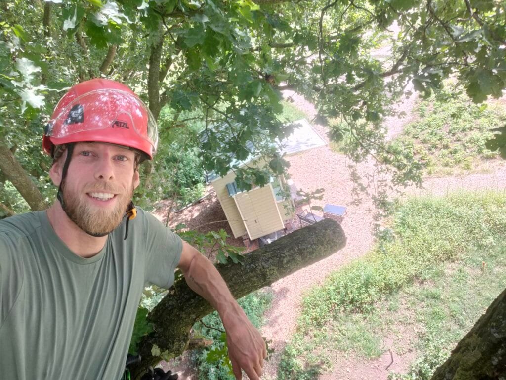 We doen zoveel, maar soms voelt het alsof er zo weinig is om te laten zien… Maar nu is er zeker wat te laten zien. Ron ging namelijk de boom in! Hij deed de afgelopen tijd 4 dagen klimcursus en verzamelde alle klimmaterialen bij elkaar. Na nog twee dagen opfriscursus was het deze week echt zover: hij beklom en snoeide onze eiken. Om te beginnen bij de eiken die boven het toekomstige huis staan en daarom gesnoeid moeten worden.