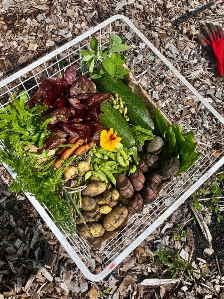 Pluksla, kropsla, wolmunt, courgettes, nieuwzeelandse spinazie, 3 soorten aardappels, radijspeulen, peultjes, doperwten, oost-indische kers, gele uien, wortels.
