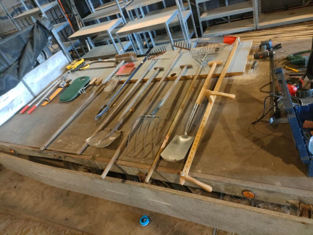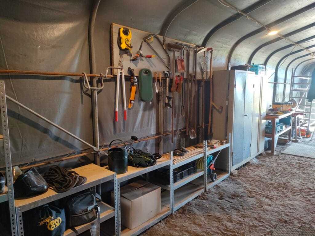 Ondertussen werkt Ron verder aan het inrichten van de tent. Hij zet stellingen in elkaar, hangt gereedschap en andere spullen op en geeft alles een logische plek. Het is hierdoor echt al een praktische werkruimte aan het worden.