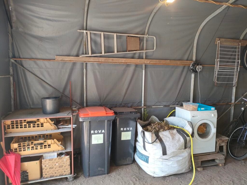 Het afvalstation, de wasmachine en de bigbag met japanse duizendknoop hebben een handige plek bij de deur. Als we willen wassen moeten we de tuinslang uitrollen en aansluiten op de wasmachine.