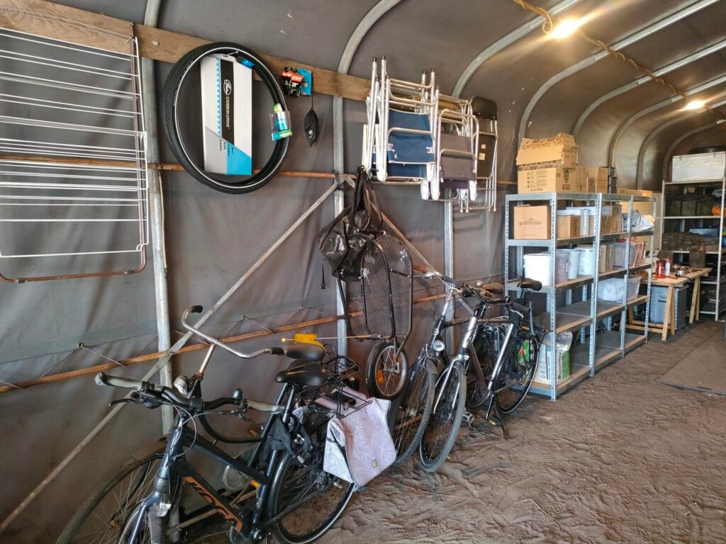 De fietsen met daarboven onderdelen voor de fietsen, extra stoelen en daarachter de stellingen met onze bulk-voorraad.