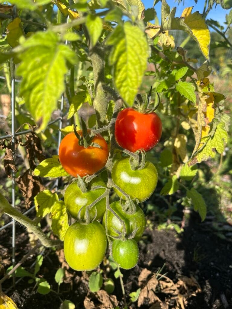 Een paar tomaten hebben het voor elkaar gekregen om af te rijpen.